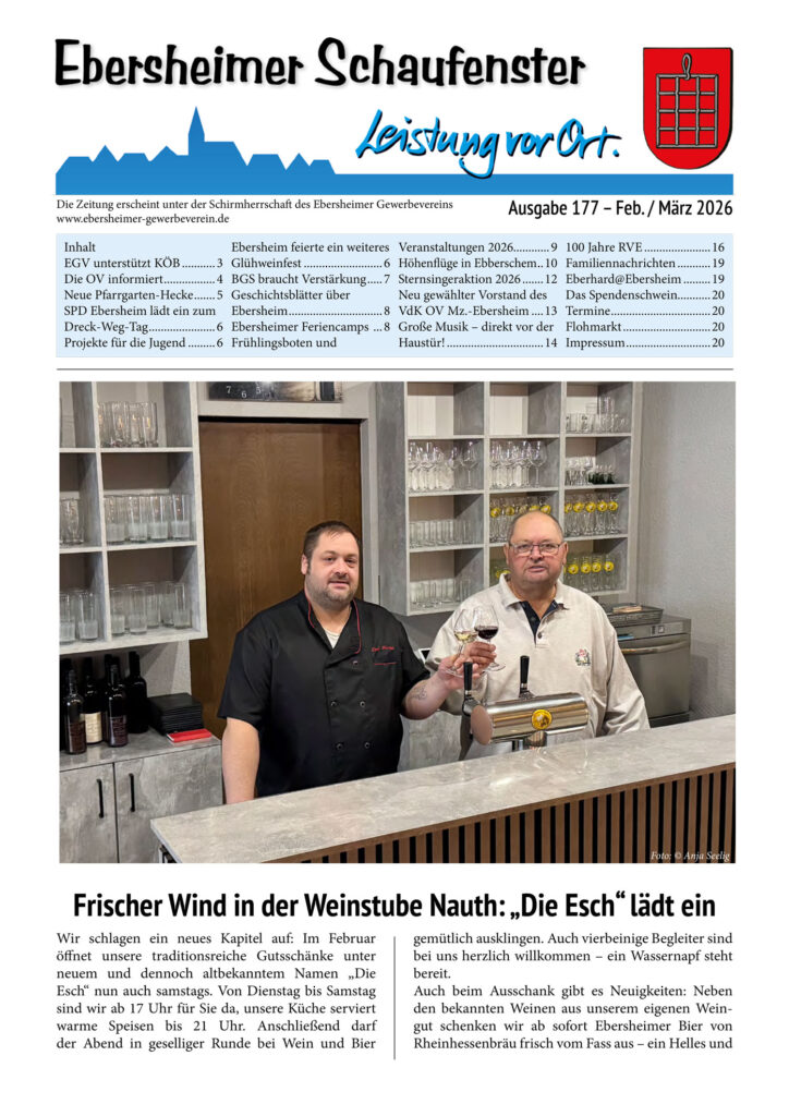 Vor über 25 Jahren wurde das Ebersheimer Schaufenster vom Ebersheimer Gewerbeverein e.V. initiiert und berichtet seitdem regelmäßig über das örtliche Gewerbe in Ebersheim, über Aktivitäten der Vereine und das Geschehen im Ort.